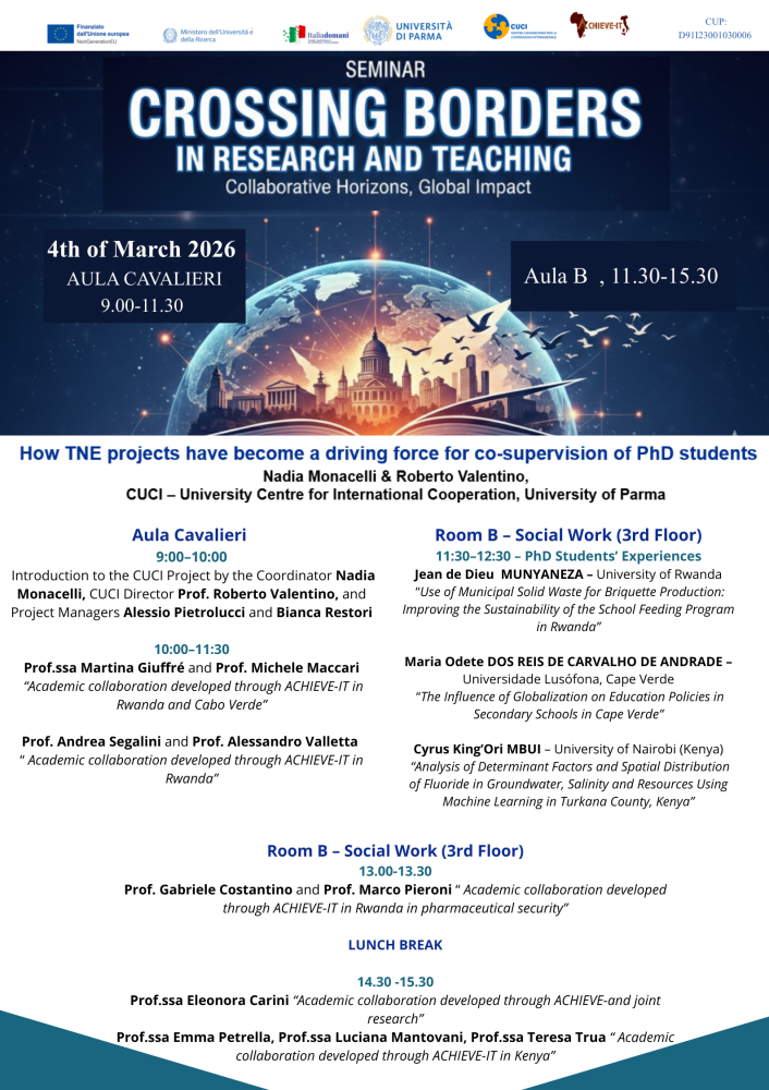 The University of Parma will host on 3–4 March 2026 the bilingual international seminar “Crossing Borders, Decolonizing Knowledge”, organized by CUCI – University Center for International Cooperation within the framework of the ACHIEVE-IT Project (Academic Collaboration through Higher International Education for a Viable and Equitable Africa with Italy – CUP: D91I23001030006), in collaboration with the ParTeR – Participatory Teaching and Research Group.